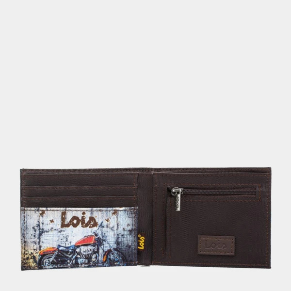 Billetero horizontal de la marca Lois . Este billetero lleva un compartimento superior y seis compartimentos múltiples para tarjetas o documentación. Un monedero interior con cremallera. Medidas: 10,5×8,5 cm.