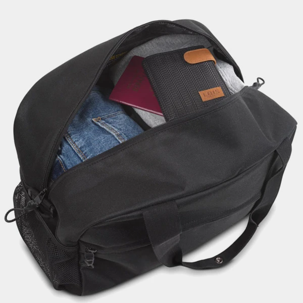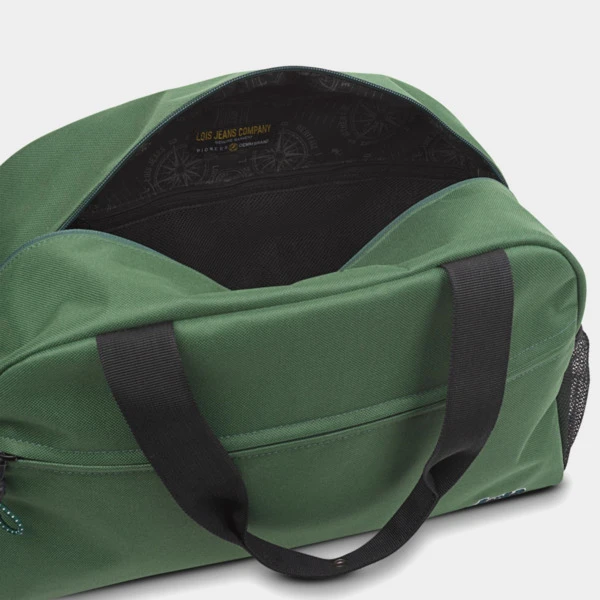 Bolsa Viaje Hombre de Material Resistente y Ligero marca Lois. Bolsa Deporte Mujer – Bolso de Viaje Mujer Fin de Semana. Bolsa con tamaño máximo permitido como 2ª bolsa de mano para cabina. Con asa larga y regulable adicional. Bolsillo interior con cierre de cremallera. Banda trasera para adaptar al trolley. Bolsillos laterales de rejilla. Bolsa de deporte hombre grande. Material: Poliéster reciclado Interior: Forro de poliéster estampado con etiqueta interior representativa de la marca. Bolsa Deporte Grande. A destacar el logo bordado , el cursor al tono , y el detalle de la cinta en contraste. Medidas: 40x25x20 cm. Peso: 0 kg. Material: Poliéster.