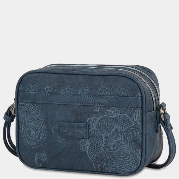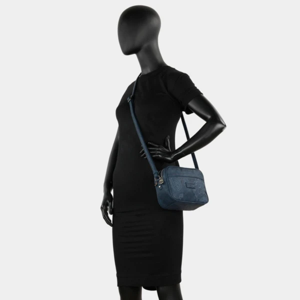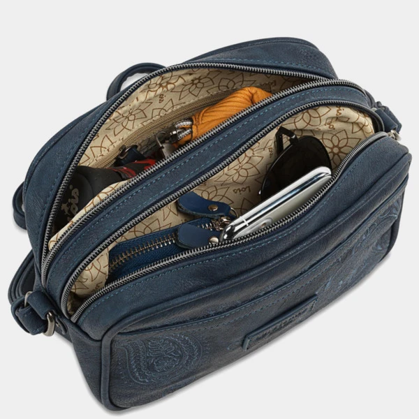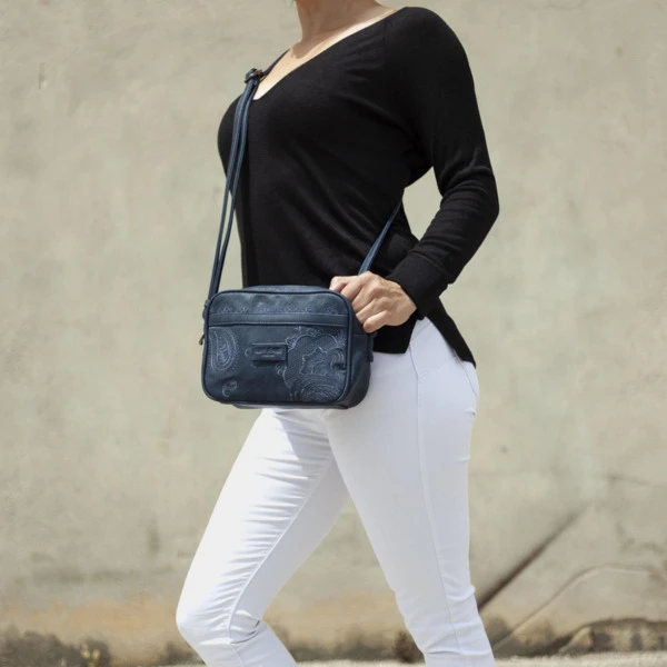 Bolso bandolera ajustable con doble cremallera. En la parte trasera incluye un departamento con cremallera. El interior contiene un bolsillo con cremallera, mas otro bolsillo individual. El lining o forro, está personalizado acorde al diseño exterior.
