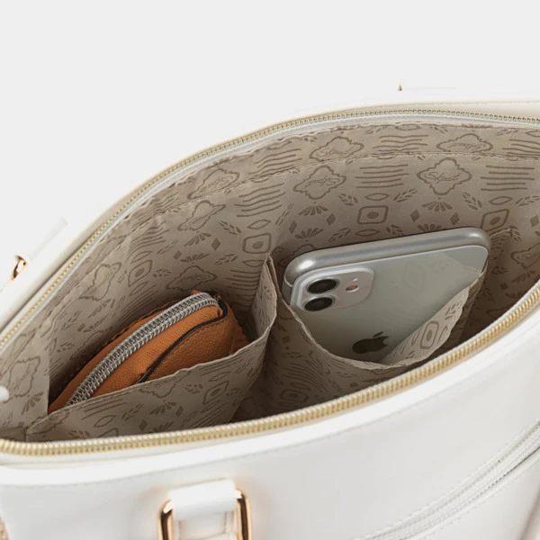 Bolso de mano con bandolera adicional. Bolsillo trasero e interior con cierre de cremallera. Bolsillos interiores organizadores.