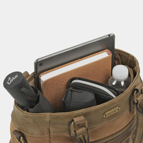 Confeccionado en poliéster y lona combinada con detalles de piel sintética, material resistente y ligero, el bolso ha sido pensado y diseñado para ser el complemento ideal de todos los días.