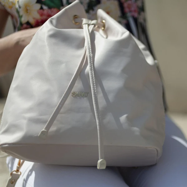 Exterior: El cierre del bolso es con cordón fruncido, esto da un toque singular a la pieza.