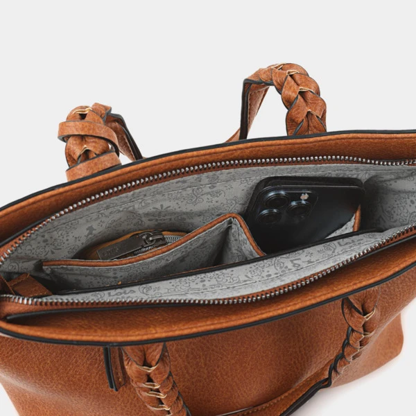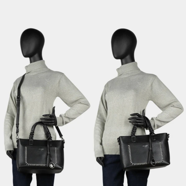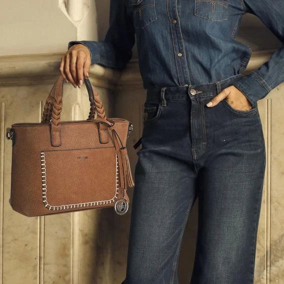 Bolsos Grandes Bolsos de Mujer. Bolso de mano con bandolera adicional. Bolsillo trasero e interior con cierre de cremallera. Bolsillos interiores organizadores. Bolso Mujer Grande. Exterior: Piel sintética , la cual cumple con los standars ECOFRIENDLY Interior: Forro estampado y etiqueta interior representativa de la marca. Bolsos de Mujer. A destacar el detalle trenzado de las asas , el llavero , el pespunte decorativo del bolsillo frontal y las cremalleras metálicas. Medidas: 30x21x11 cm. Peso: 0,63 kg. Material: Polipiel.