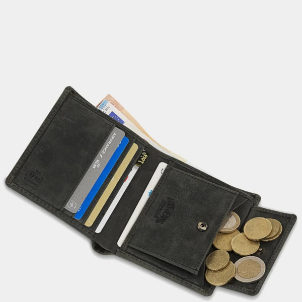 Con capacidad para 5 tarjetas. Con solapa interior sujeta con cierre a presión. Con 2 departamentos para billetes.