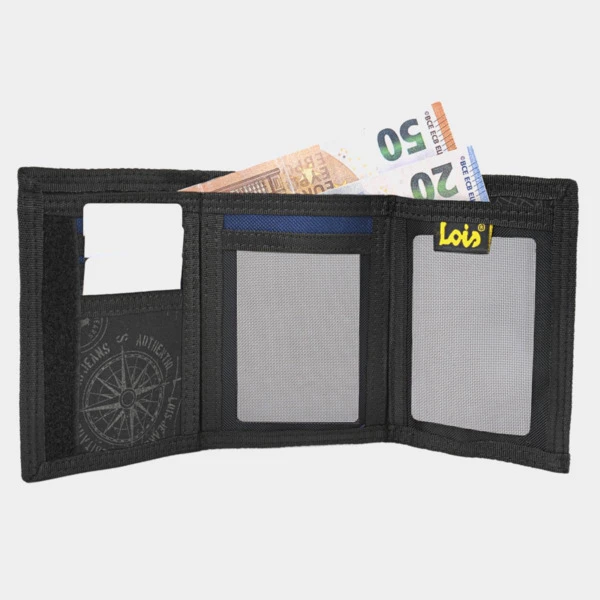 Cartera hombre con monedero de la marca Lois. Diseño único y exclusivo de la marca. Cartera de Hombre – Carteras para hombre Pequeñas – Billetera Hombre. Características Especiales: Con protección RFID. Bolsillo trasero con cierre de cremallera. Billetera Hombre – Cartera Pequeña Hombre – Cartera hombre Pequeño. Material: Poliéster. Interior: Forro de poliéster estampado con etiqueta interior representativa de la marca. A destacar el logo bordado , el cursor al tono , y el detalle de la cinta en contraste. Carteras Hombre Pequeñas. A destacar el logo bordado , el cursor al tono , y el detalle de la cinta en contraste. Medidas: 13,5×9,5×1 cm. Peso: 0,06 kg. Material: Poliéster.