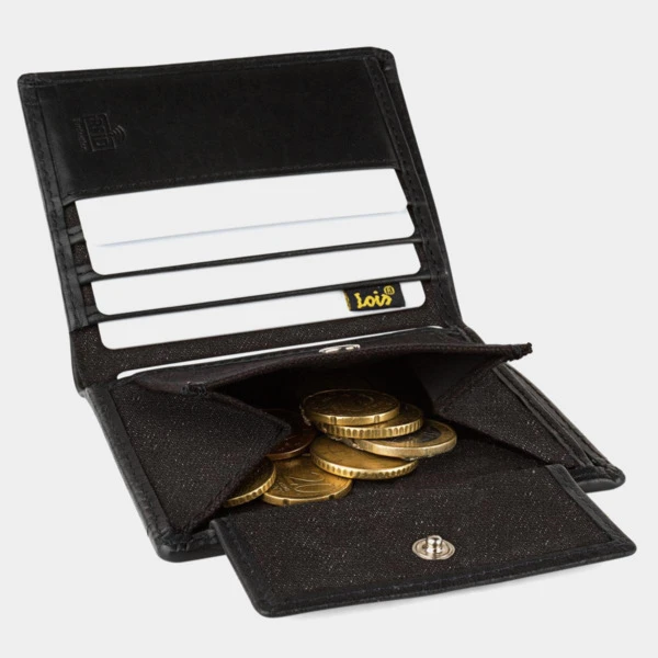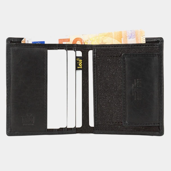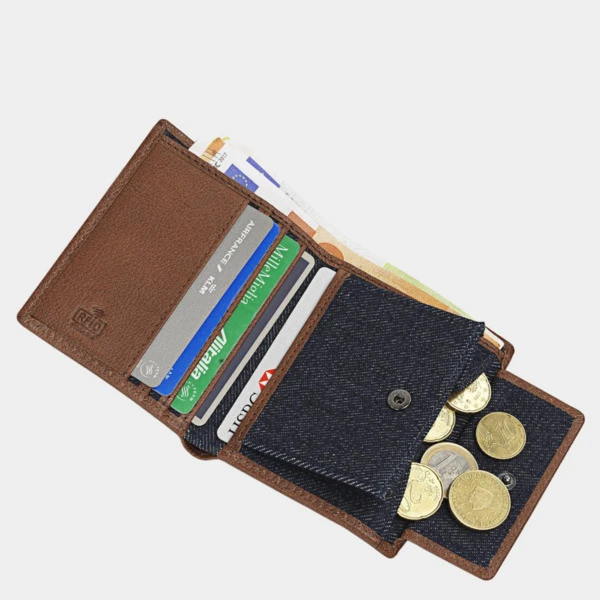 Cartera con departamento para billetes. Lleva un portamonedas interior con cierre a presión y capacidad para 5 tarjetas.