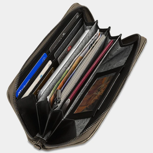 Exterior:Cartera con Sistema RFID Protection, impide el acceso por radiofrecuencia a nuestras tarjetas. Tu dinero, además de estar elegantemente guardado, estará seguro. Asa de mano adicional.