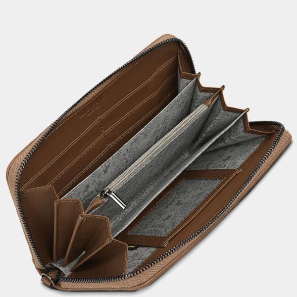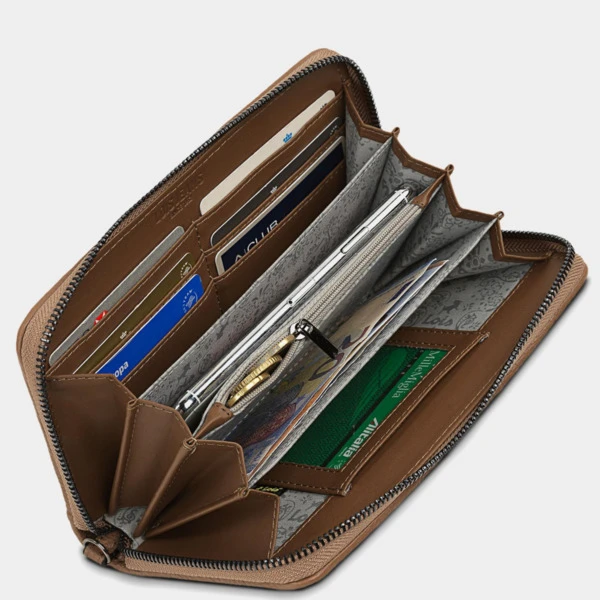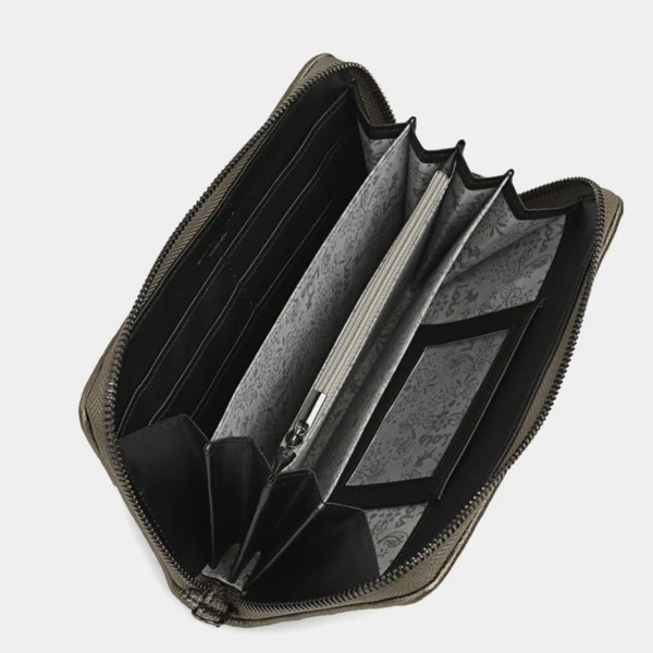 Interior: Con 5 departamentos individuales, uno de ellos con cierre cremallera. Contiene diferentes departamentos para tarjetas y documentación, uno de ellos transparente. Forro personalizado y etiqueta interior representativa de la marca.