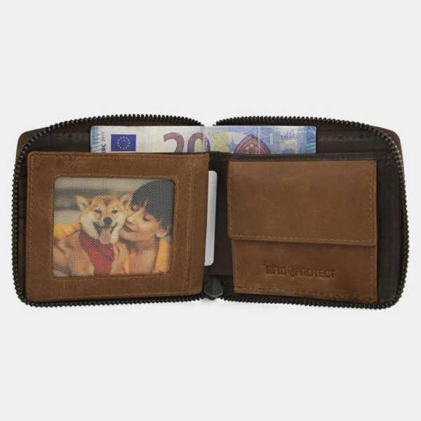 Múltiples compartimentos para tarjetas, billetes y monedas.