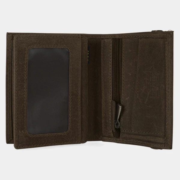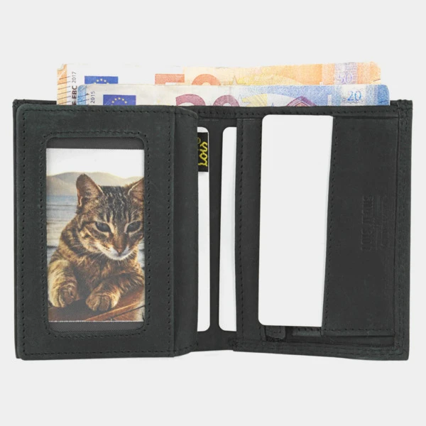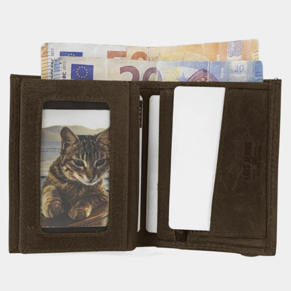 Múltiples compartimentos para tarjetas, billetes y monedas.