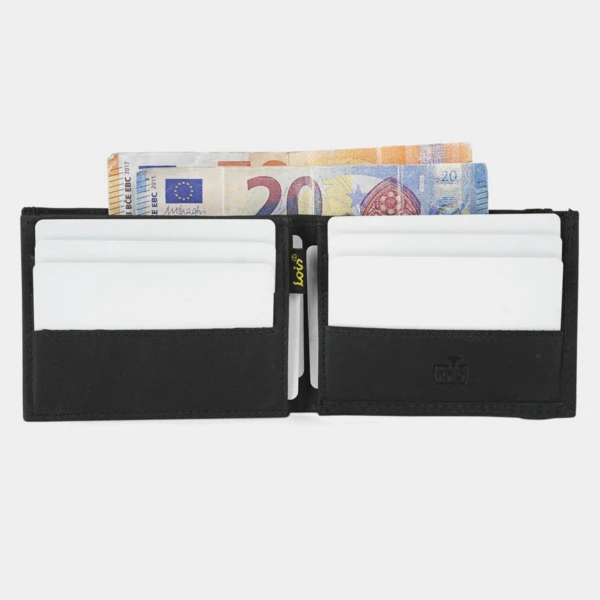 Múltiples compartimentos para tarjetas, billetes y monedas.