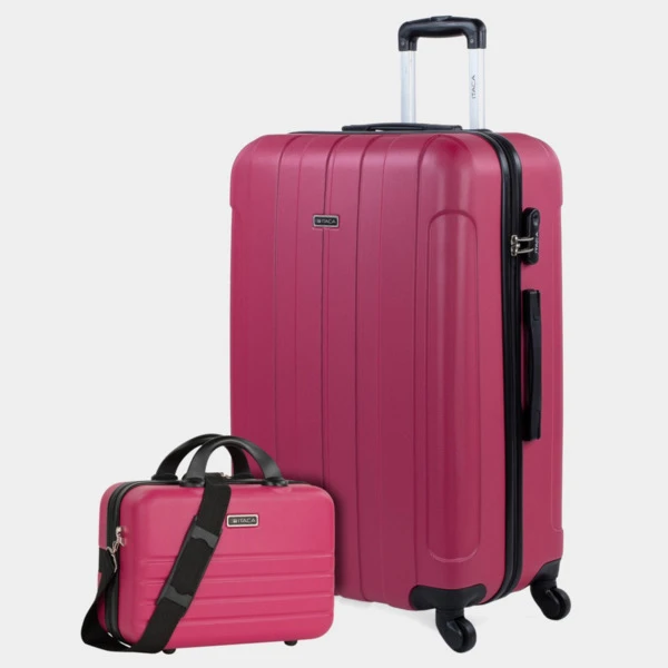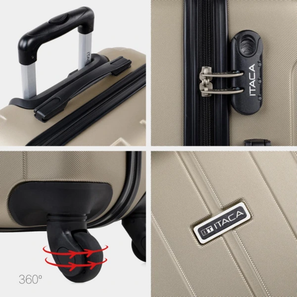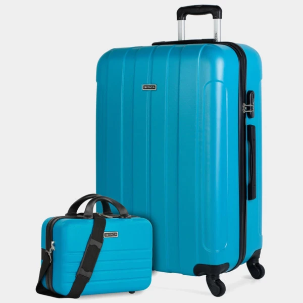 ITACA lanza un nuevo juego de maletas de viaje rígidas. Set de neceser + maleta tamaño 70 realizadas con ABS, un material ligero y a la vez resistente. Otra ventaja es que permite mayor maniobrabilidad con sus 4 ruedas giratorias 360° multidirección de suave rodamiento y su trolley telescópico con seguro hacen que su manejo sea más cómodo. Dispone de una cremallera con doble cursor y cerradura con combinación LOCK para una mayor seguridad. En su interior, contemplamos el forro personalizado de la marca, con separación central. Contiene correas elásticas interiores que permiten la sujeción del contenido. Las maletas grandes miden 48 x 73 x 28 cm. y pesa 3,90 kg. El neceser tiene un interior con separación central, compartimento con cremallera para las cosas mas pequeñas y cinta elástica para tener los objetos más pequeños bien sujetos. Mide 31x22x15 cm y pesa 0,8 kg.