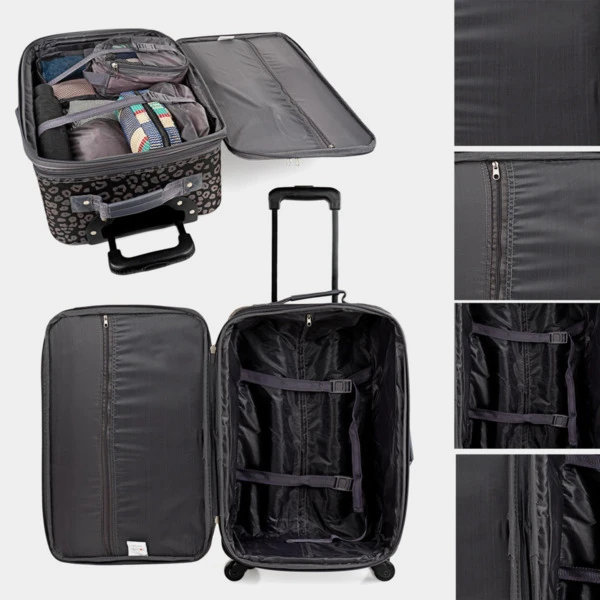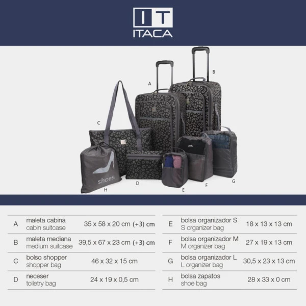 Juego completo set de 2 maletas trolley mas bolsas organizdoras con rejilla de ventilación, bolsa para zapatos, estuche de mano y bolsa grande de hombro de la firma ITACA. 4 ruedas giratorias y mango telescópico. Forro interior. Compartimento separador con cremallera y bandas elásticas ajustables. Varios compartimentos. Set Maletas de viaje con ruedas – Maleta tela Poliester 100% Alta resistencia y durabilidad, este producto es el resultado de la evolución de la marca ITACA en su continua búsqueda de la mejor calidad al mejor precio. Maletas de viaje cabina , pequeña y mediana. El interior está forrado con Nylon personalizado acorde al diseño de la maleta. Para la organización del equipaje cuenta con correas, bolsillos y cremalleras para asegurar la sujeción y el orden. Las 4 ruedas aseguran un transporte fácil y manejable, el asa extensible adapta la maleta a cualquier altura de usuario. Perfectas para aerolíneas 23 kilos facturada y 10 kilos cabina. Medidas: 39,5x67x23 cm. Peso: 6 k