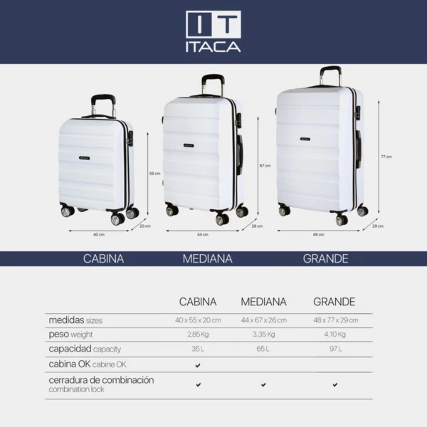 La maleta pequeña, que es una CABINA LOW COST, mide 39 x 55 x 20 cm. y pesa 2,85 kg. La maleta mediana mide 44 x 67 x 26 cm. y pesa 3,35 kg.