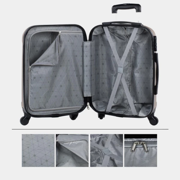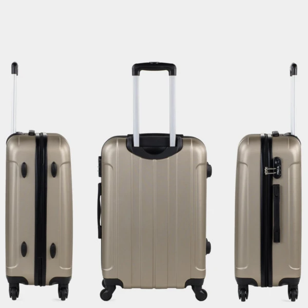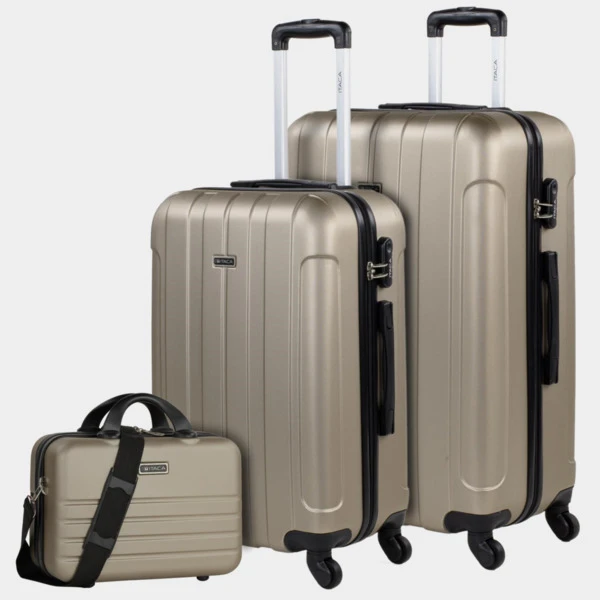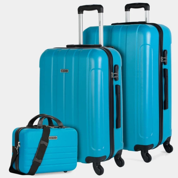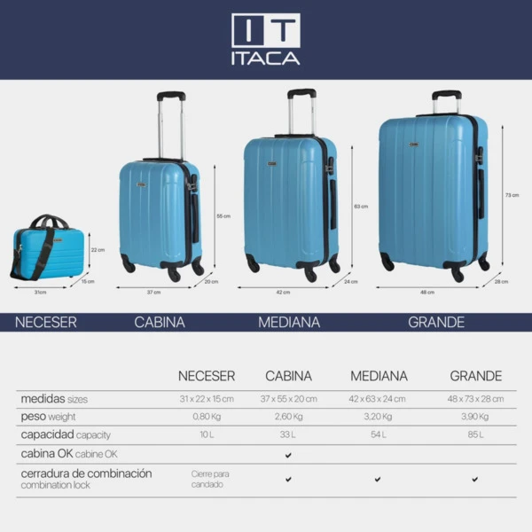 ITACA lanza su nuevo juego de maletas de viaje cabina, medianas y grandes. Set de neceser + 2 maletas tamaño 60/70 realizadas con ABS, un material ligero y a la vez resistente. Otra ventaja es que permite mayor maniobrabilidad con sus 4 ruedas giratorias 360° multidirección de suave rodamiento y su trolley telescópico con seguro hacen que su manejo sea más cómodo. Dispone de una cremallera con doble cursor y cerradura con combinación LOCK para una mayor seguridad. En su interior, contemplamos el forro personalizado de la marca, con separación central. Contiene correas elásticas interiores que permiten la sujeción del contenido. La maleta mediana, mide 65 x 42 x 23 cm. y pesa 3,30 kg. La maleta grande mide 48 x 73 x 28 cm. y pesa 3,90 kg. El neceser tiene un interior con separación central, compartimento con cremallera para las cosas mas pequeñas y cinta elástica para tener los objetos más pequeños bien sujetos. Mide 31x22x15 cm y pesa 0,8 kg.