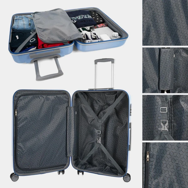 Juego completo set de maleta trolley mas neceser de la firma ITACA. 4 ruedas giratorias y mango telescópico. Forro interior. Compartimento separador con cremallera y bandas elásticas ajustables. Varios compartimentos. Set de maletas de viaje con ruedas. El Policarbonato es un material muy resistente y ligero, con un acabado brillante precioso, permite cualquier estampado dando como resultado maletas ligeras, juveniles prácticas, funcionales y versátiles, ideal para regalo para niños, niña, comuniones, cumpleaños… Maletas de viaje mediana y neceser. El interior está forrado con Nylon personalizado acorde al diseño de la maleta. Para la organización del equipaje cuenta con correas, bolsillos y cremalleras para asegurar la sujeción y el orden. Las 4 ruedas dobles aseguran un transporte fácil y manejable, el asa extensible adapta la maleta a cualquier altura de usuario . Medidas: 44x65x25 cm. Peso: 4,7 kg. Material: Policarbonato.