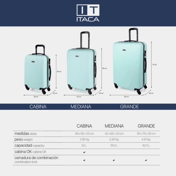 Set de tres Trolleys 60/70cm de la marca ITACA con un diseño exclusivo y dispone de varios coloridos bicolores. Con cuatro ruedas giratorias y mango telescópico. Con forro interior.