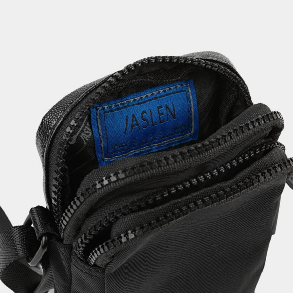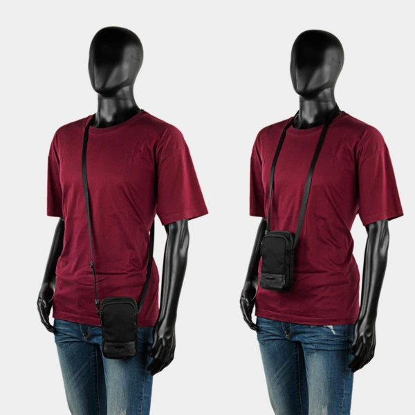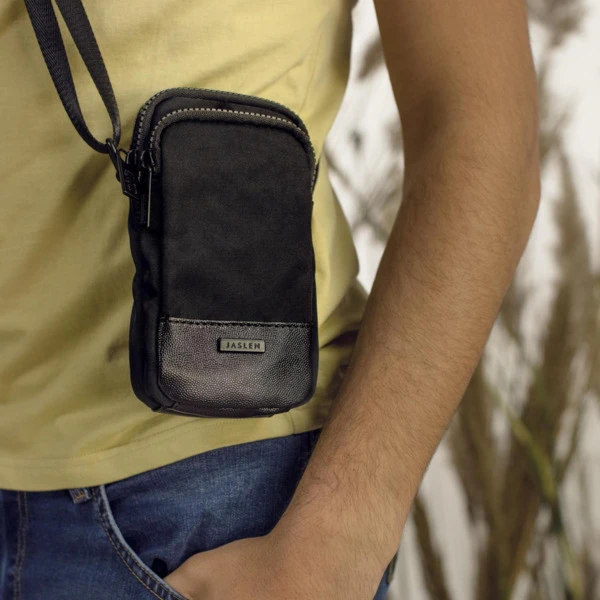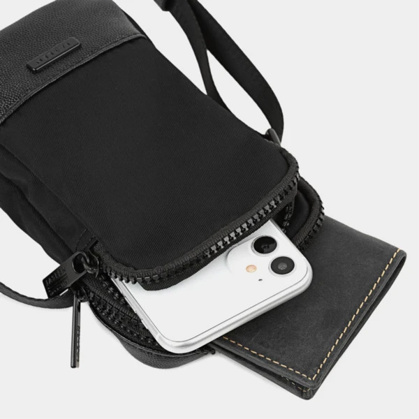 Mini bolso para teléfono con asa larga regulable. Bolsillo frontal con cierre cremallera y bolsillo trasero de rejilla.