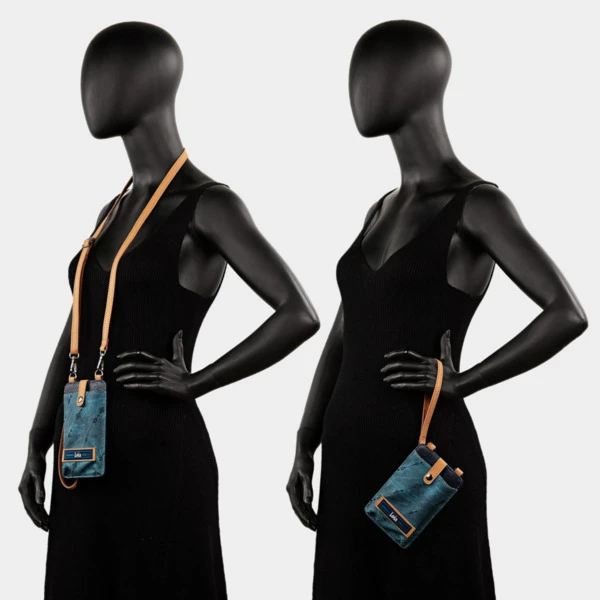Mini bolso para móvil con asa de mano y asa larga intercambiables. Bolsillo trasero con cierre de cremallera. Bolsillo frontal con cierre a presión.