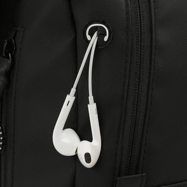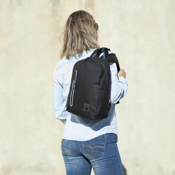 Exterior:Cremallera frontal «waterproof» con decoración reflectante. Doble tirador en cremallera principal para facilitar su apertura. Salida auriculares. Bolsillo trasero con cremallera.