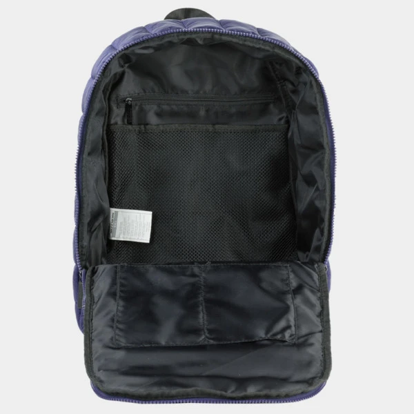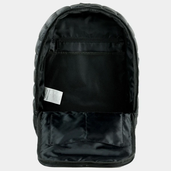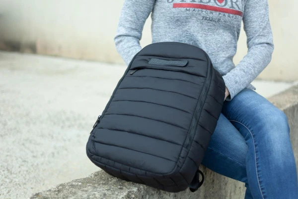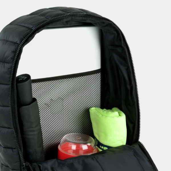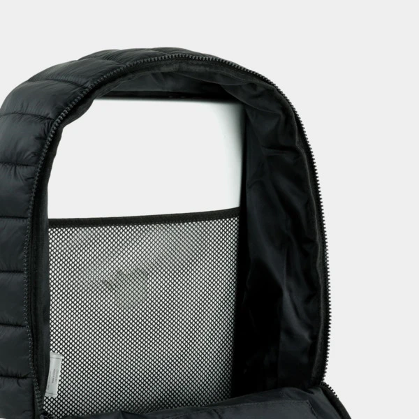 Exterior: 1 bolsillo delantero con cierre cremallera, dos tiras en la espalda acolchadas y regulables, asa de mano superior