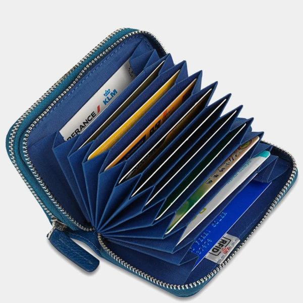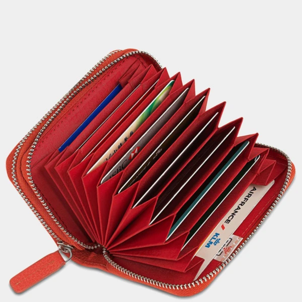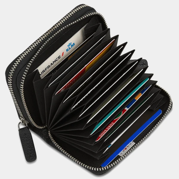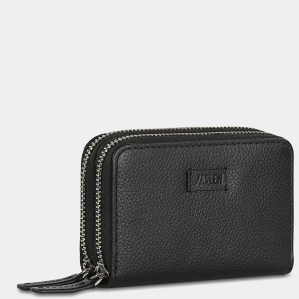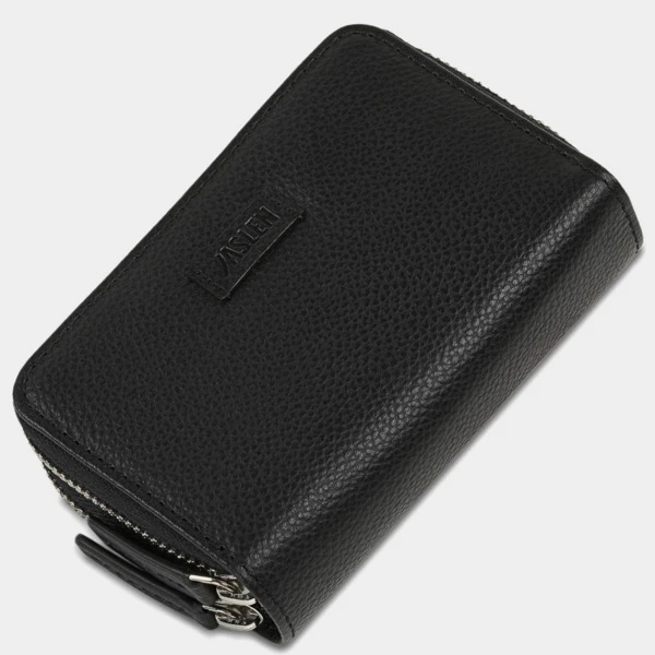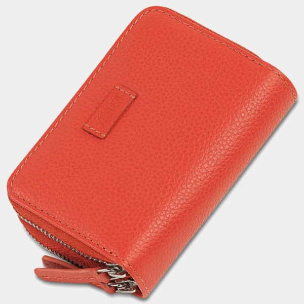 Con 2 departamentos con cierre de cremallera, uno de ellos con fuelle para gran capacidad de tarjetas. Con llavero interior.