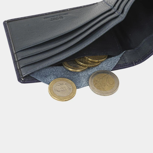 Múltiples compartimentos para tarjetas, billetes y monedas.