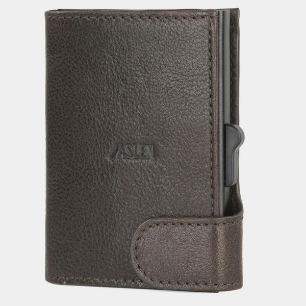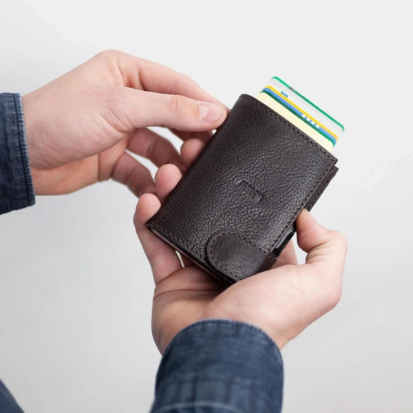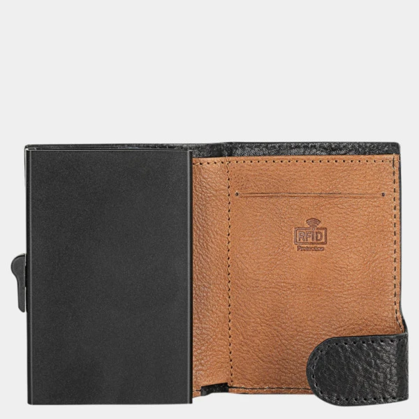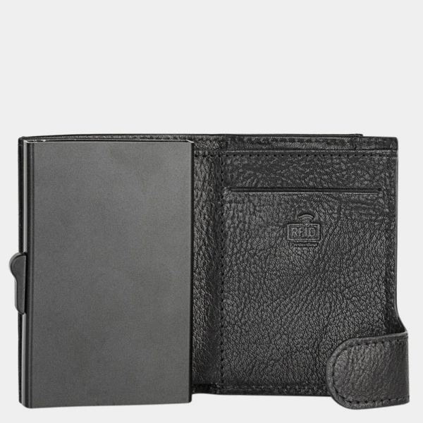 Cartera con extractor de tarjetas automático. Con capacidad de 8 tarjetas en el extractor. Compartimentos para tarjetas, billetes y monedas.