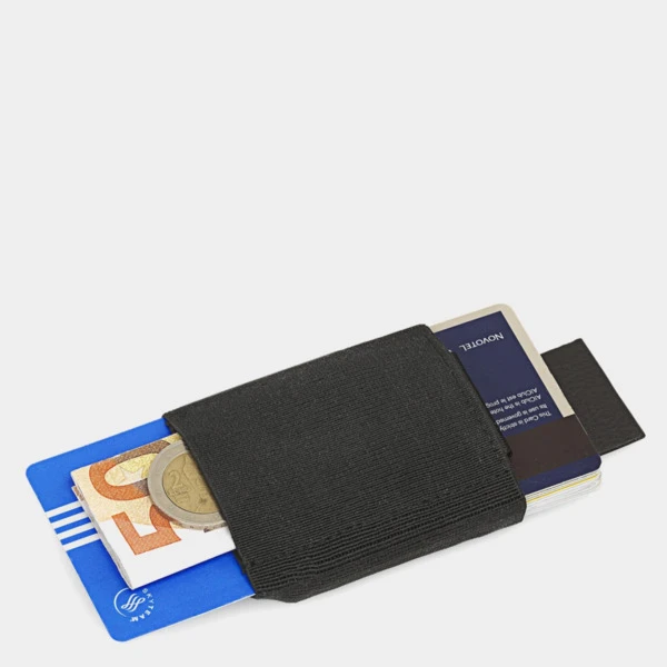 Tiene 2 compartimentos para tarjetas, uno de ellos de acceso rápido gracias a la lengüeta. Compartimento por separado para billetes y monedas.