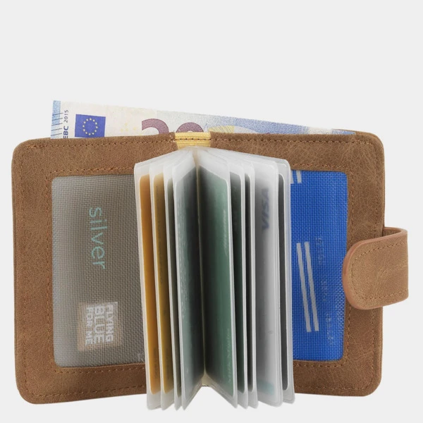 Tarjetero billetero de la marca SKAP T. Cierre con botón a presión. Monedero trasero con cremallera. Compartimento abierto para billetes. Con capacidad para 12 tarjetas y documentación, incluyendo 10 fundas transparentes. Forro estampado con el logo de la marca. Medidas: 10,5 x 7,8 cm. Material: Lona – Polipiel.